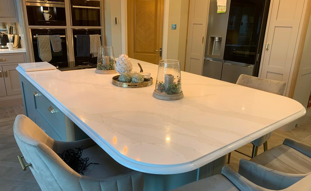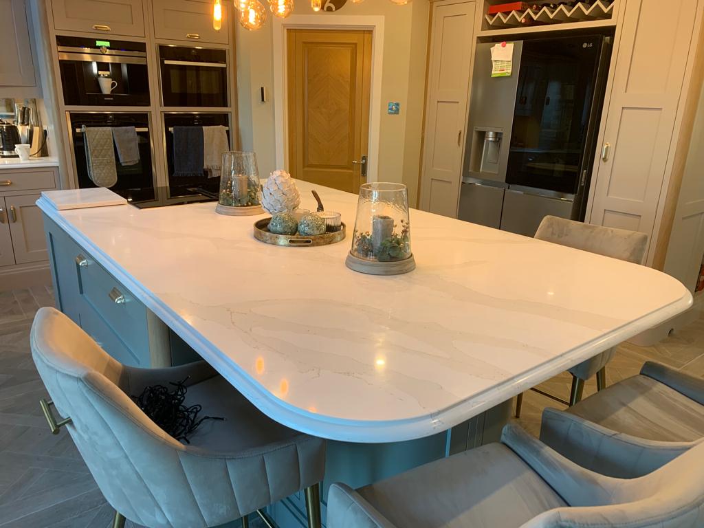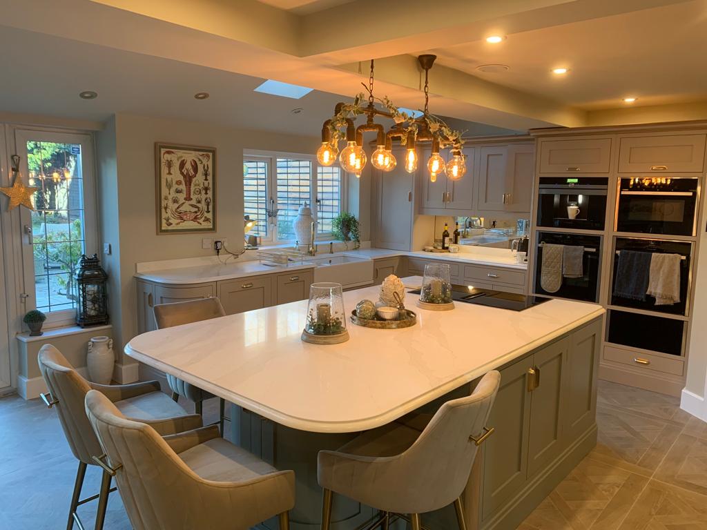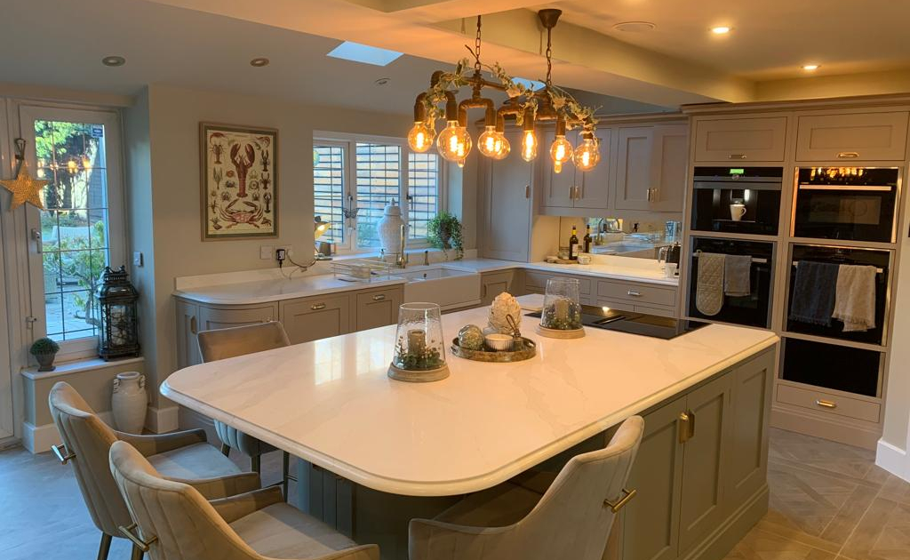 The focal point is the curved island, painted in a soft blue-grey, topped with a luxurious quartz worktop that extends into a sociable breakfast bar. Practical touches such as the inset sink and generous storage make it as functional as it is elegant.