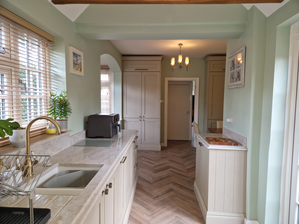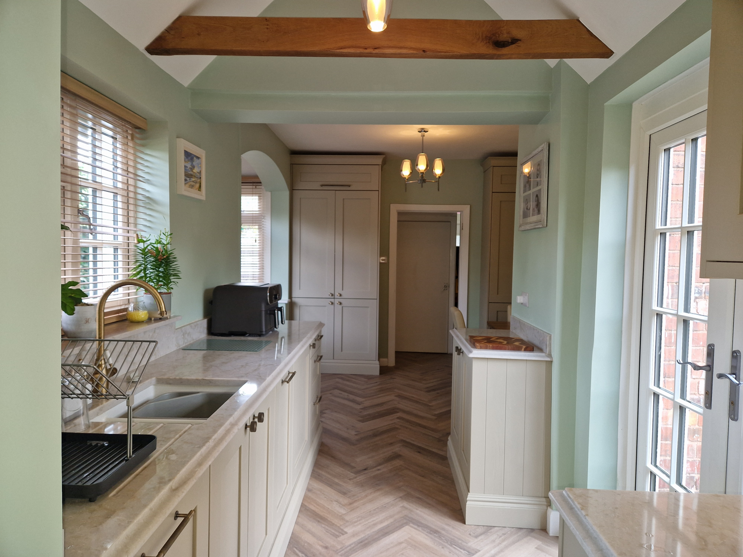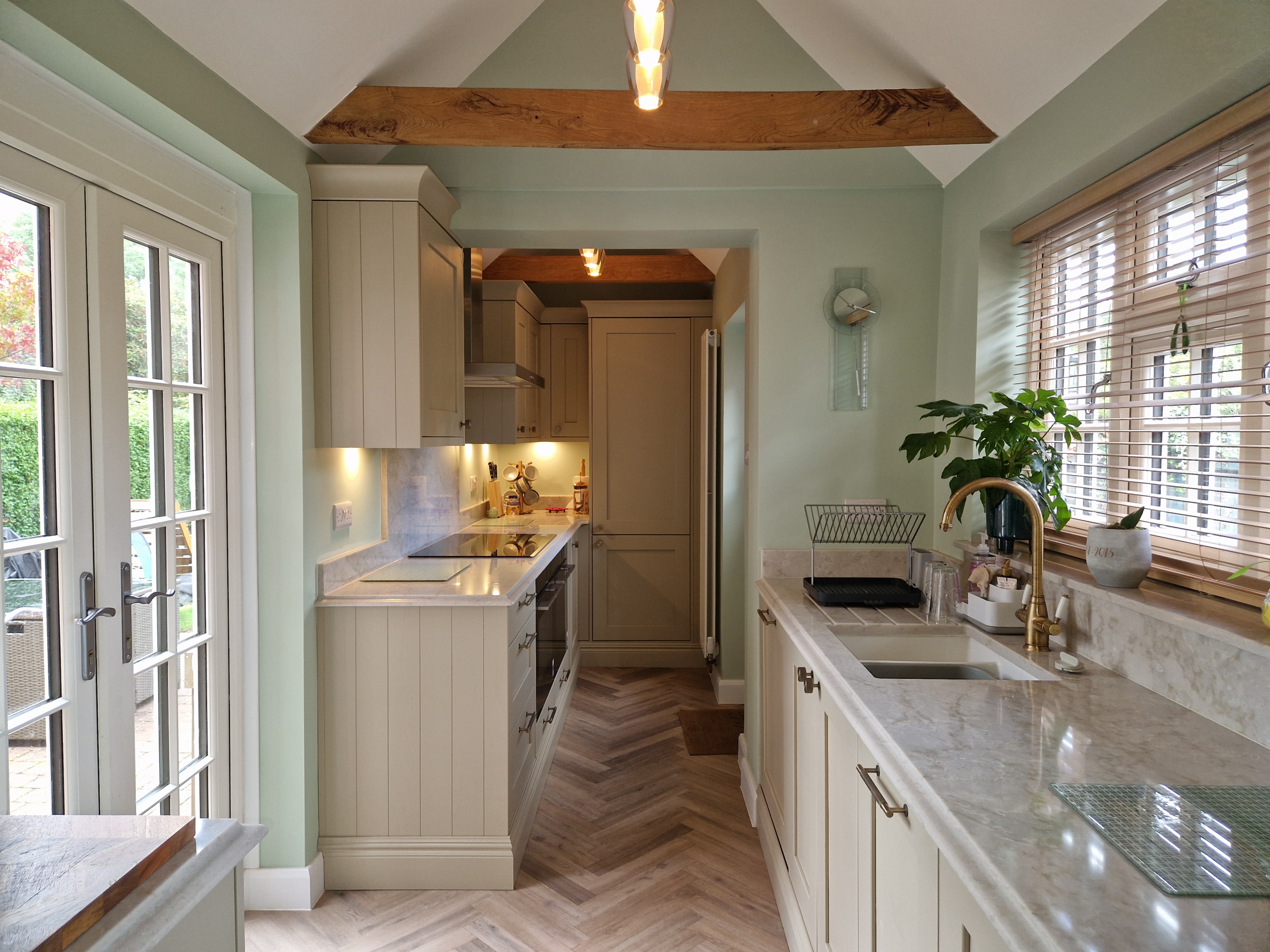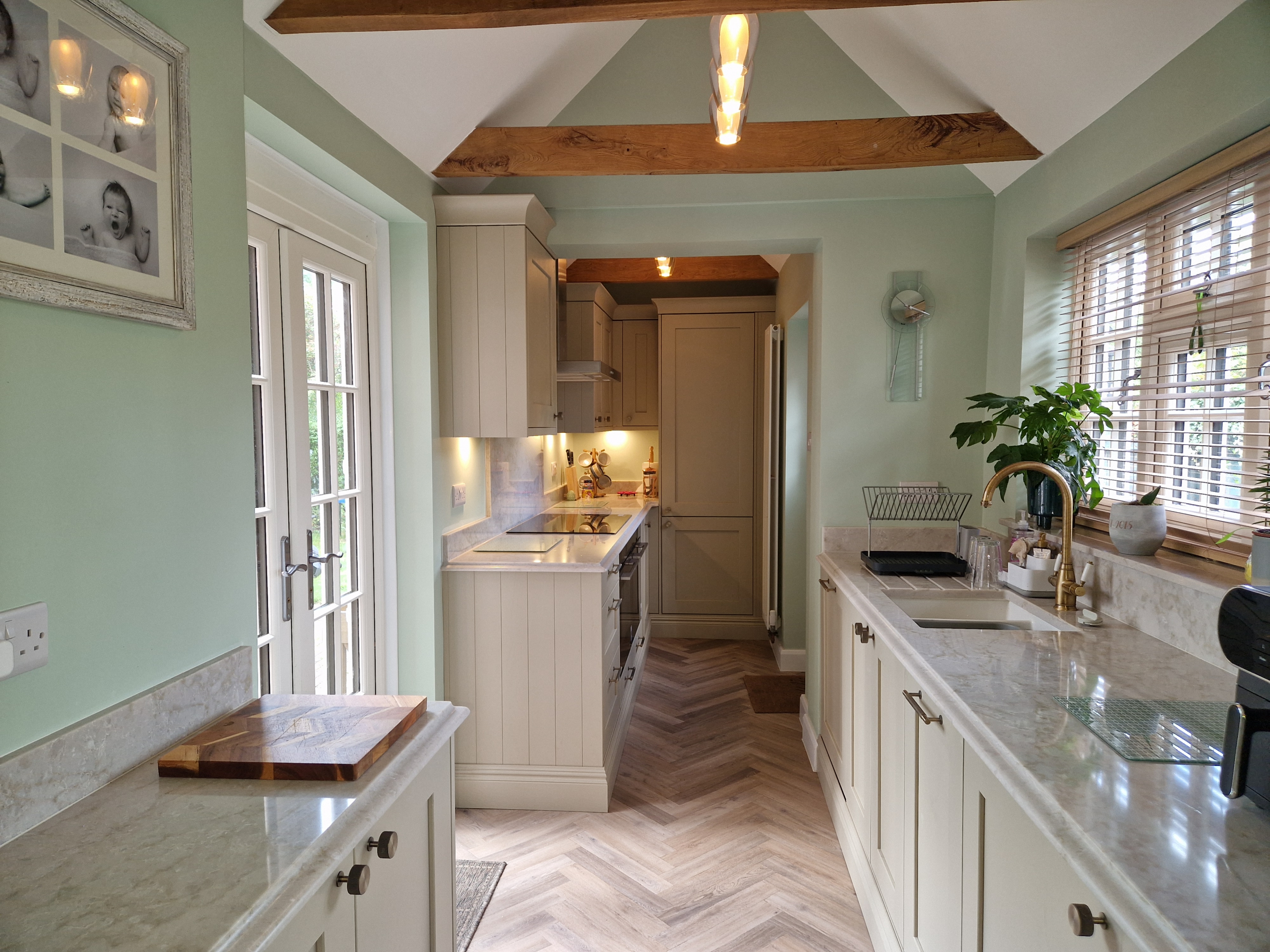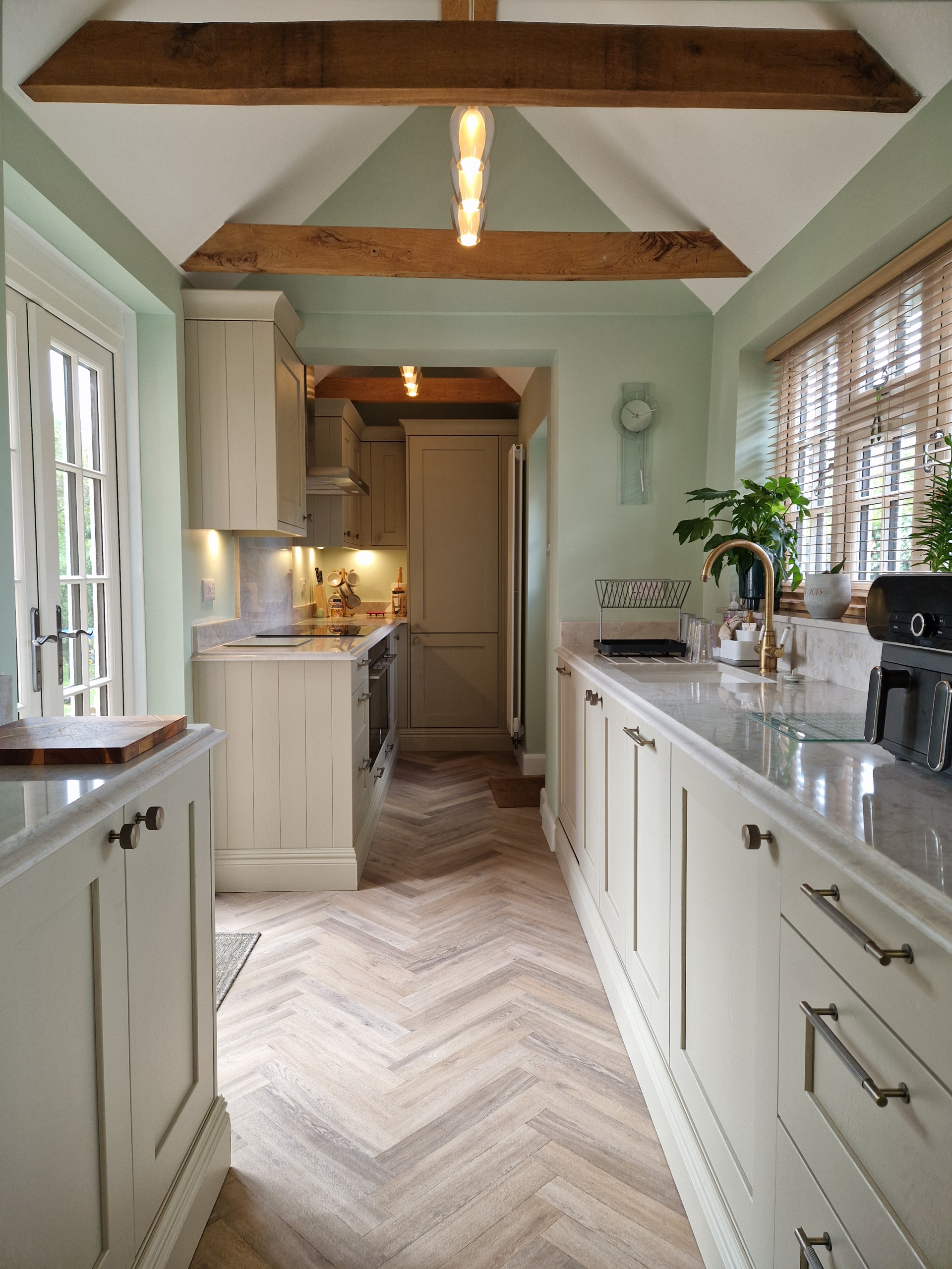 This charming galley kitchen features mid-beige cabinetry, complemented by a traditional skirting plinth that adds a classic touch. The earthy-toned quartz worktops are finished with a refined ogee edge, offering a sense of quiet luxury. Brass handles elevate the overall warmth of the space, tying in beautifully with the soft green walls and natural wood accents. Exposed ceiling beams and chevron wood flooring add rustic character and depth. A brass tap and thoughtful styling details, including greenery and soft lighting, enhance the kitchen’s cozy yet refined atmosphere. Large windows and French doors allow natural light to flood the space, creating a bright and welcoming environment.