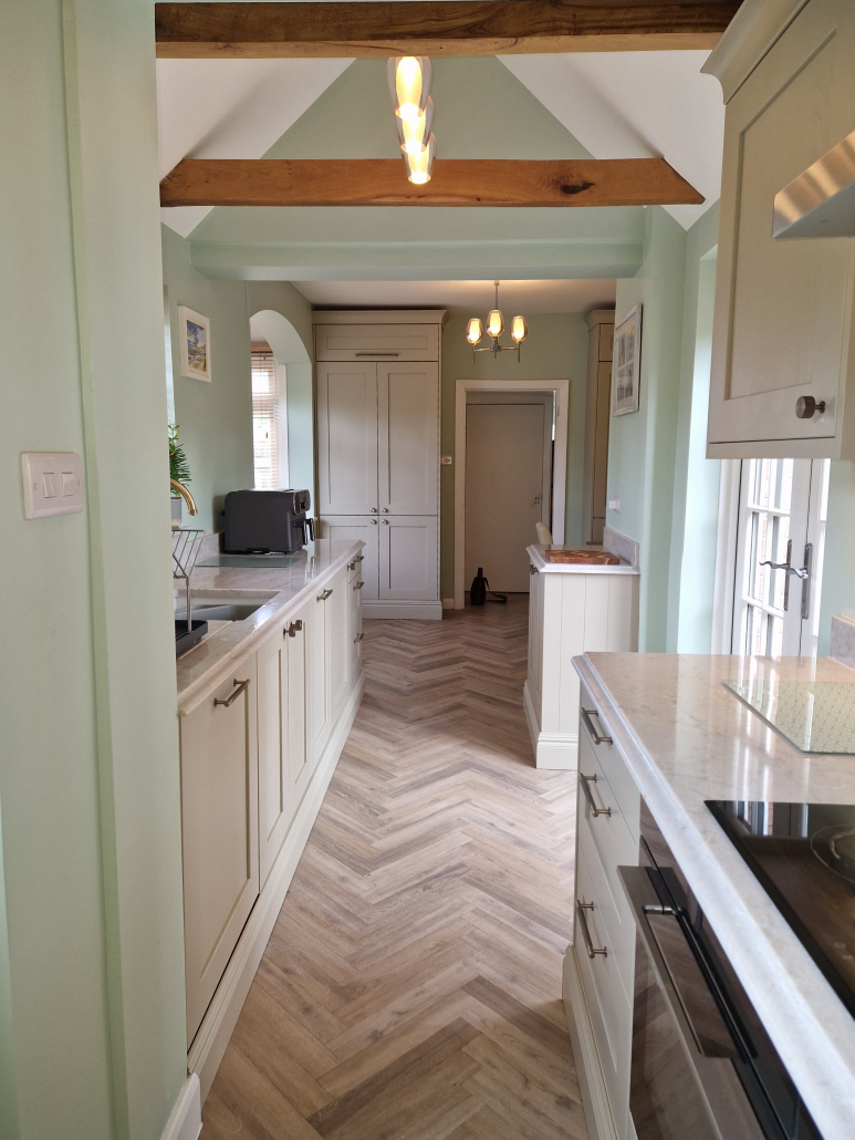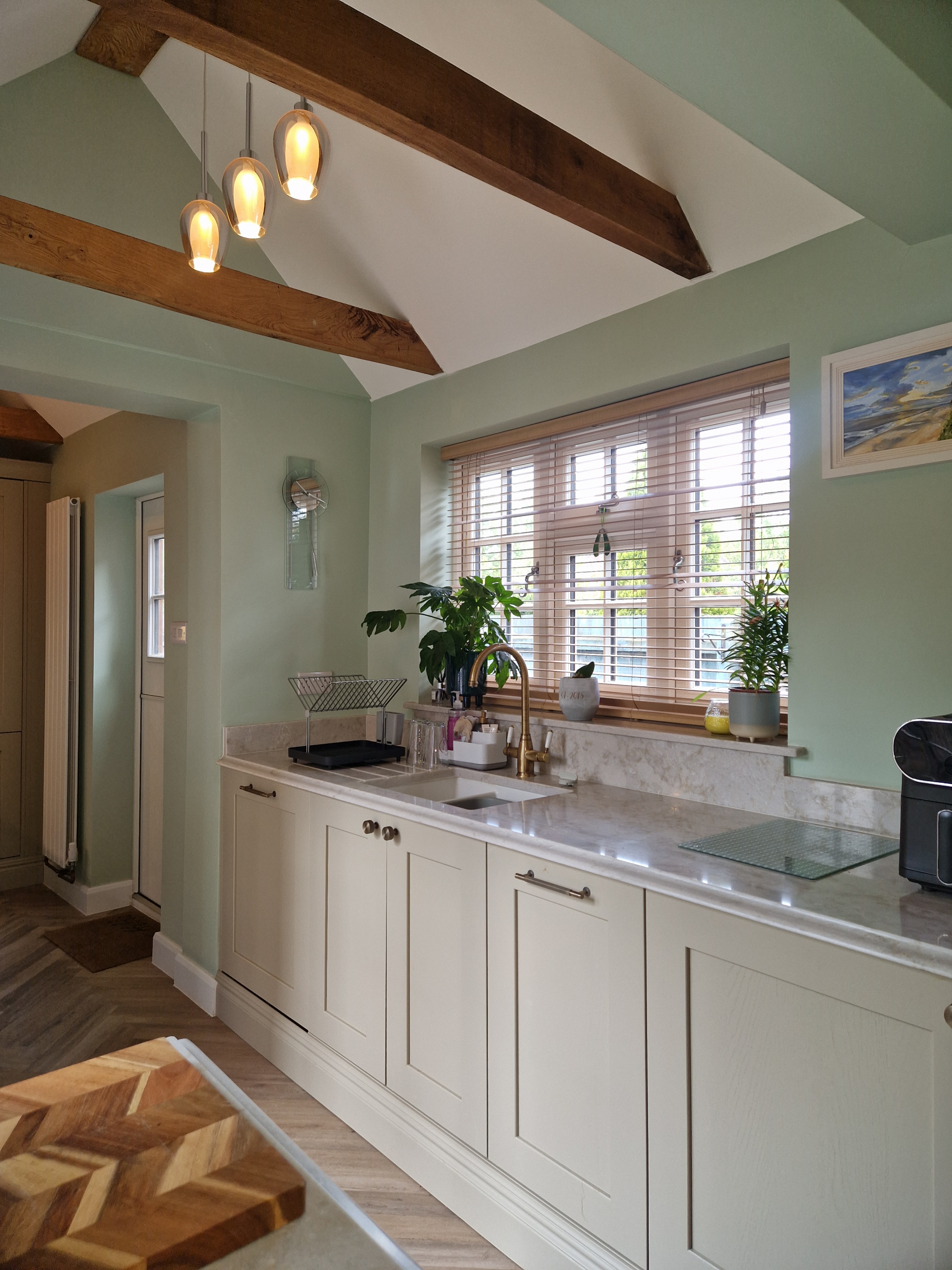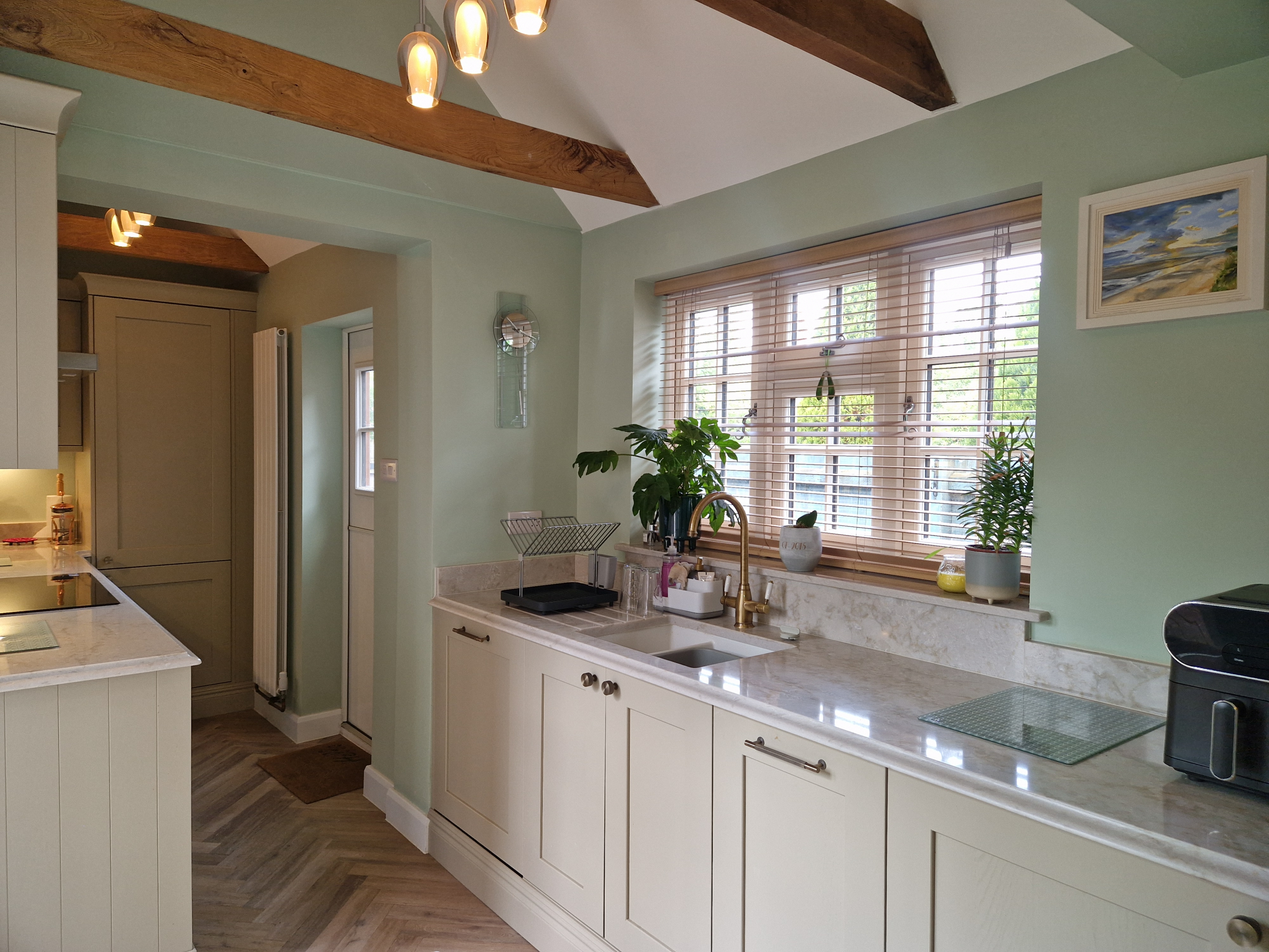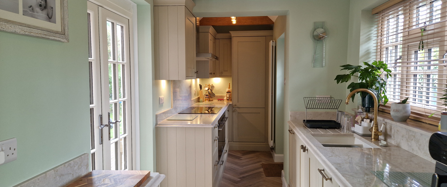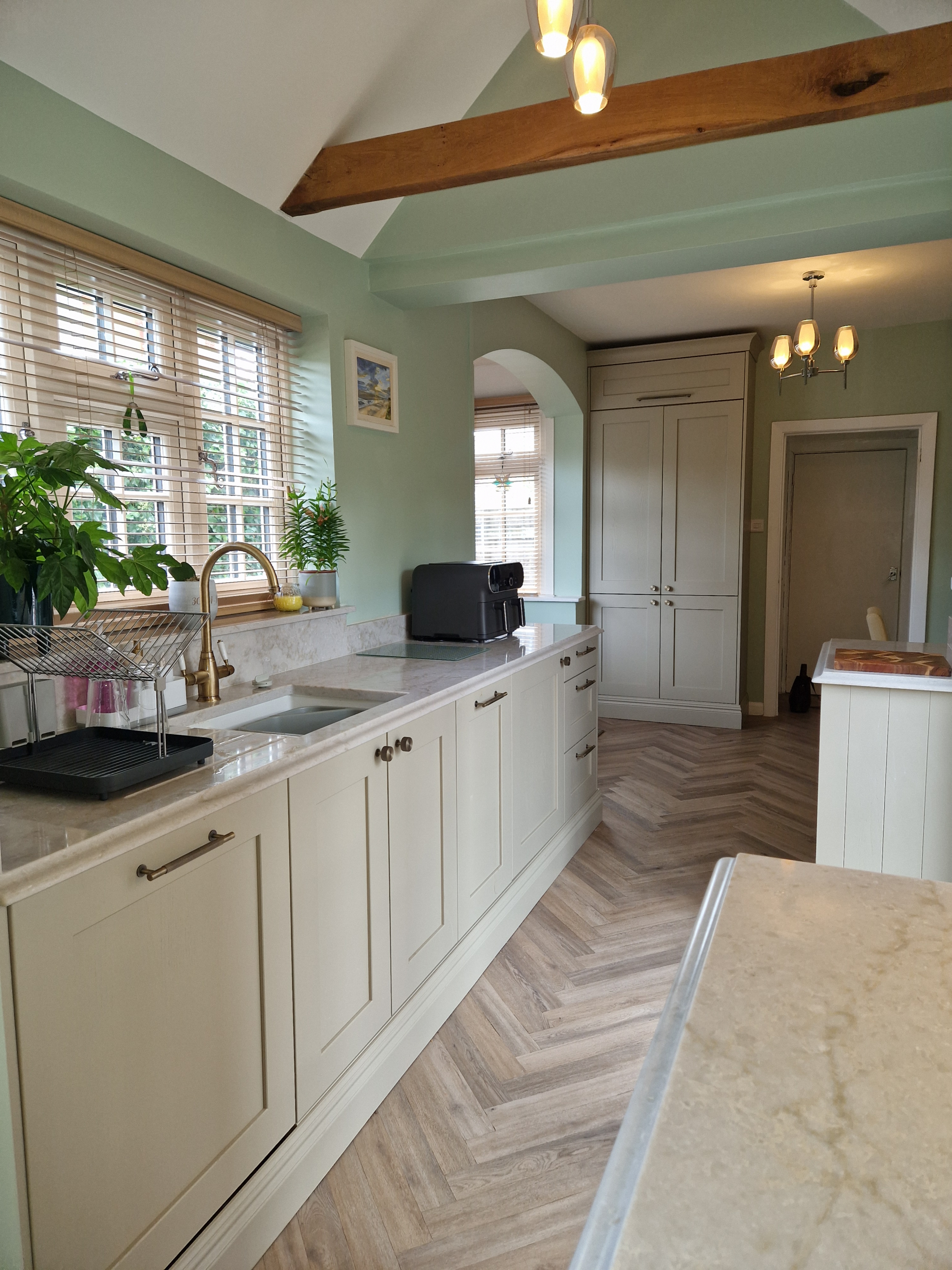 This charming galley kitchen features mid-beige cabinetry, complemented by a traditional skirting plinth that adds a classic touch. The earthy-toned quartz worktops are finished with a refined ogee edge, offering a sense of quiet luxury. Brass handles elevate the overall warmth of the space, tying in beautifully with the soft green walls and natural wood accents. Exposed ceiling beams and chevron wood flooring add rustic character and depth. A brass tap and thoughtful styling details, including greenery and soft lighting, enhance the kitchen’s cozy yet refined atmosphere. Large windows and French doors allow natural light to flood the space, creating a bright and welcoming environment.