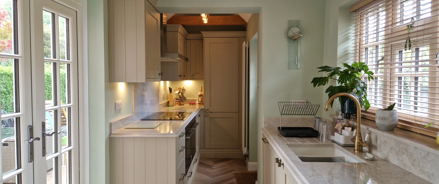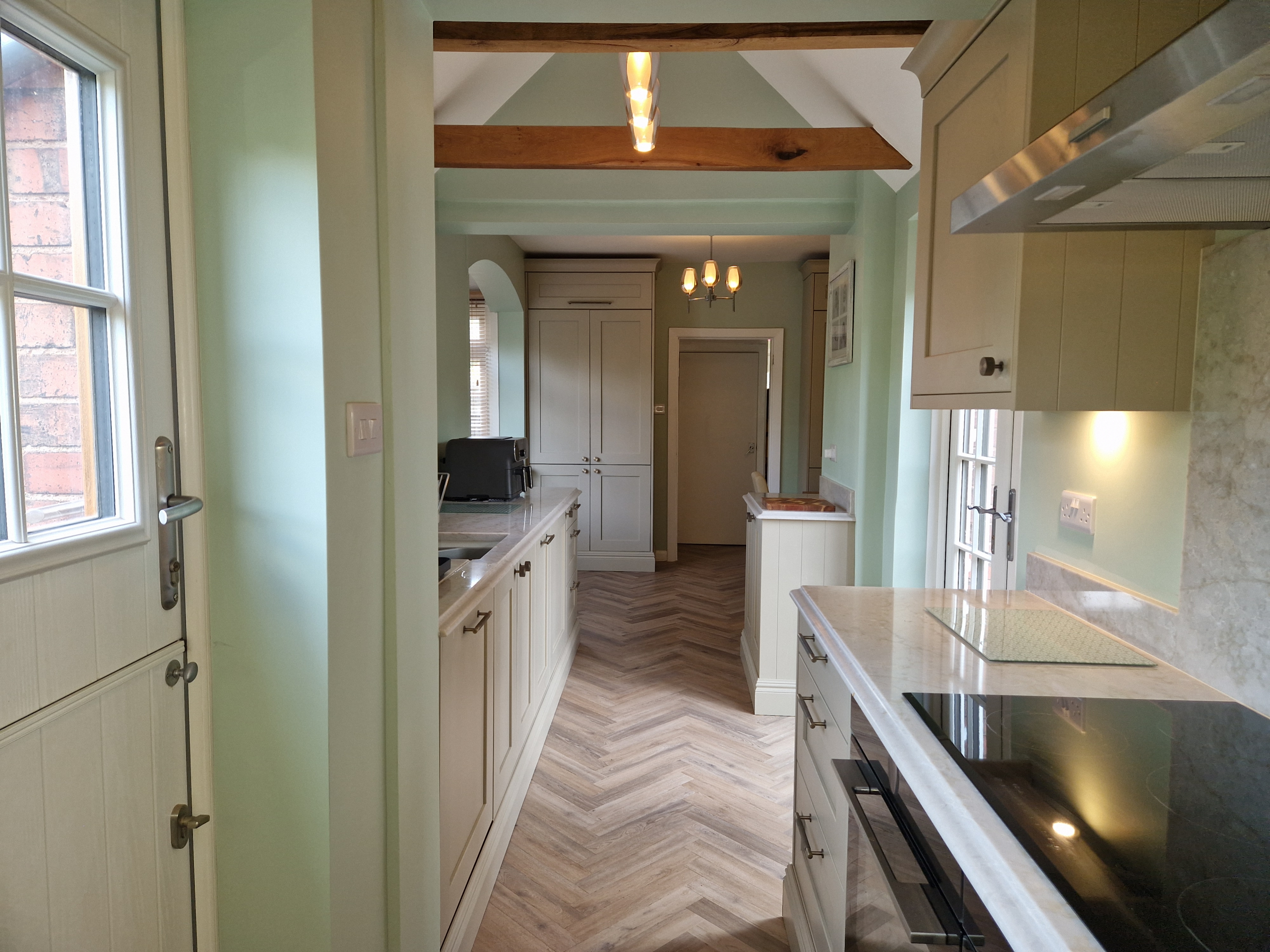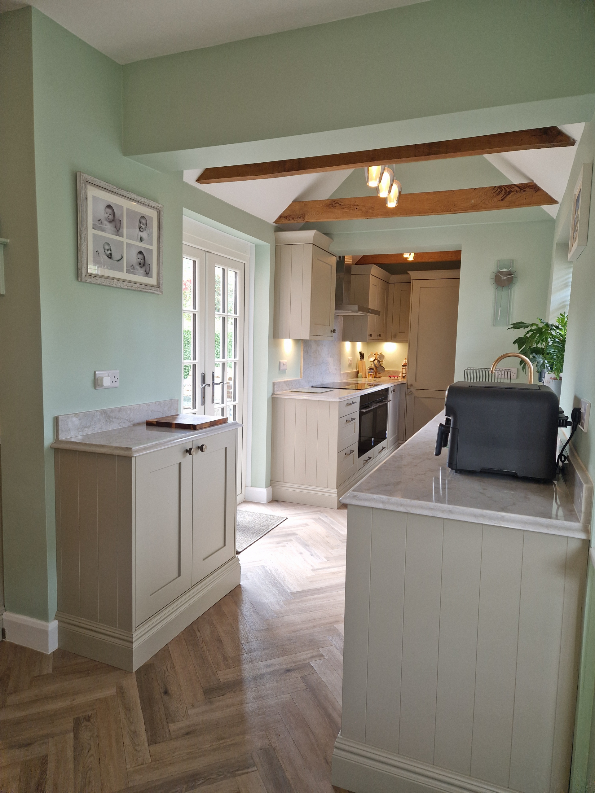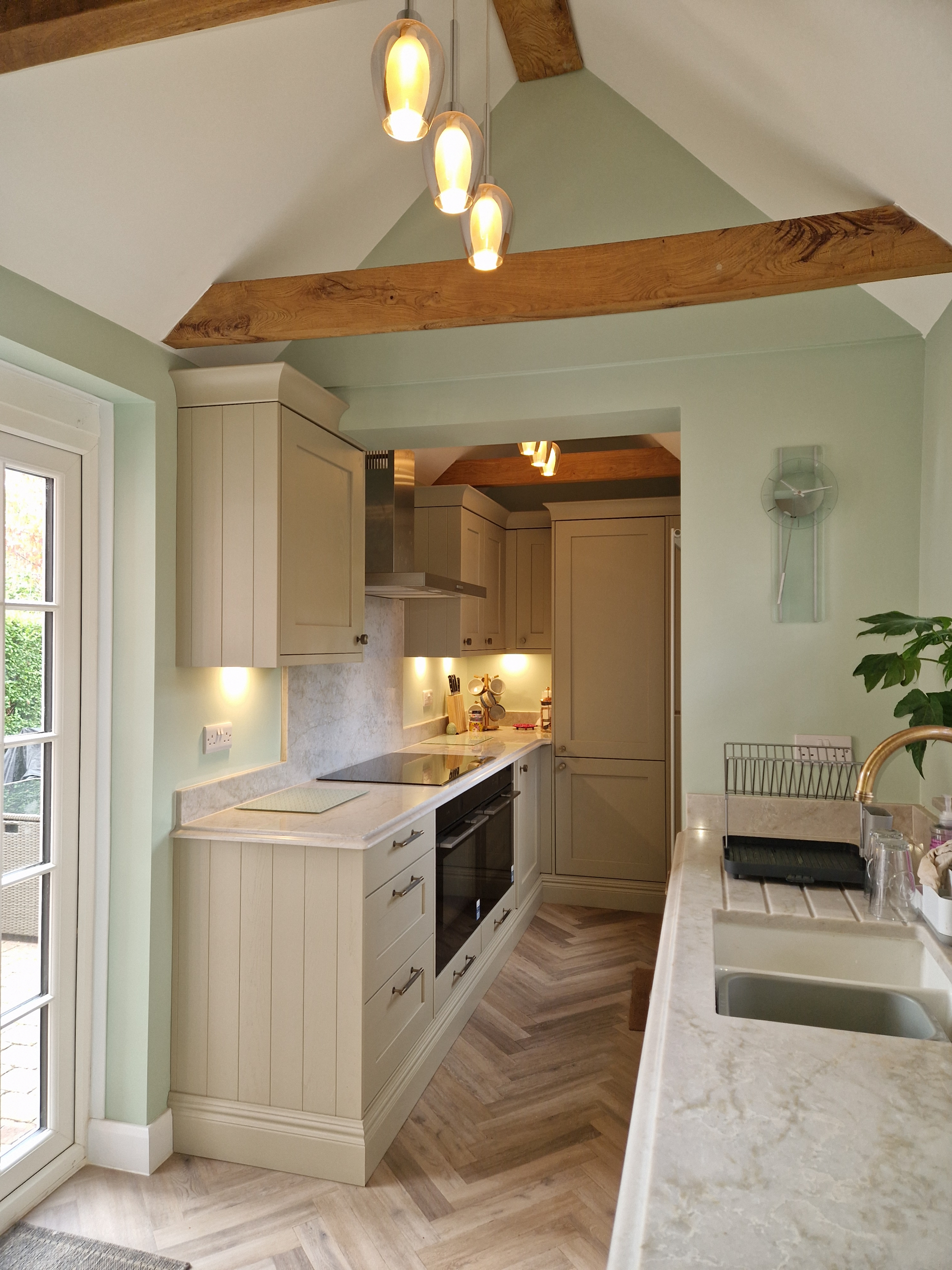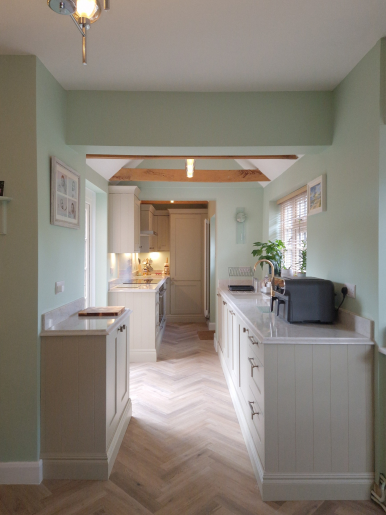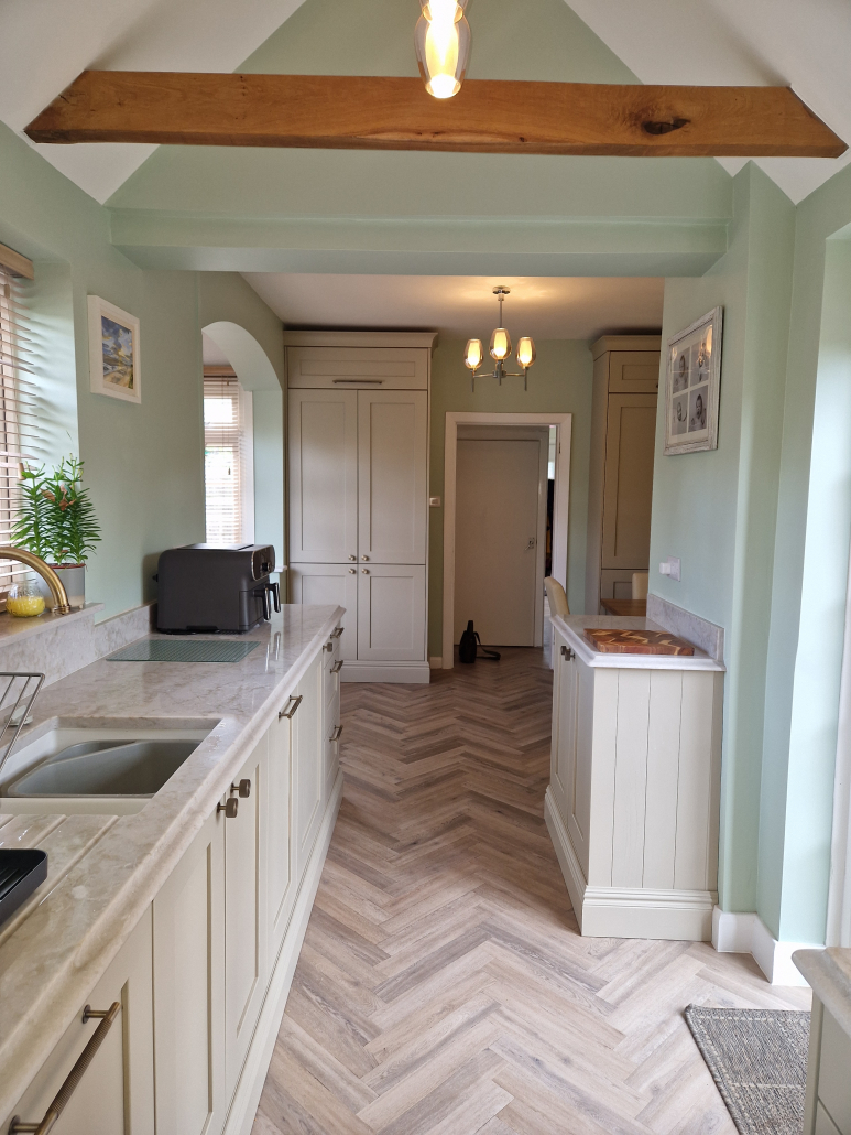 This charming galley kitchen features mid-beige cabinetry, complemented by a traditional skirting plinth that adds a classic touch. The earthy-toned quartz worktops are finished with a refined ogee edge, offering a sense of quiet luxury. Brass handles elevate the overall warmth of the space, tying in beautifully with the soft green walls and natural wood accents. Exposed ceiling beams and chevron wood flooring add rustic character and depth. A brass tap and thoughtful styling details, including greenery and soft lighting, enhance the kitchen’s cozy yet refined atmosphere. Large windows and French doors allow natural light to flood the space, creating a bright and welcoming environment.