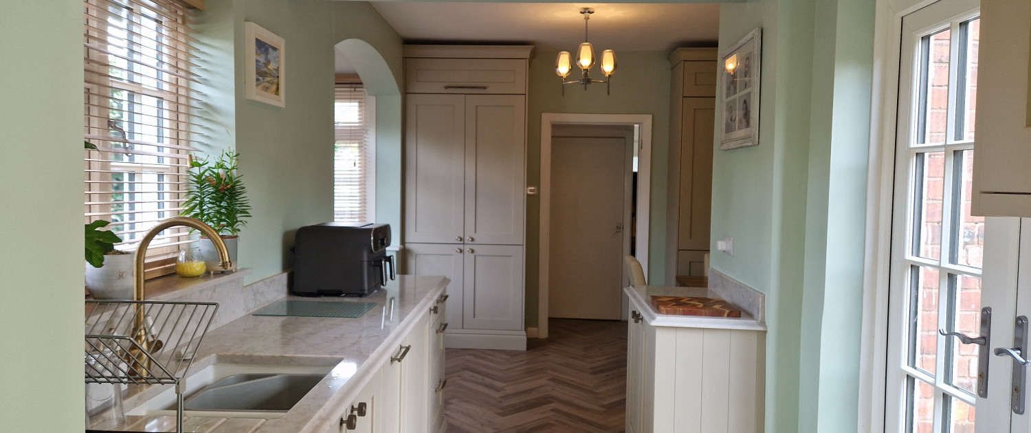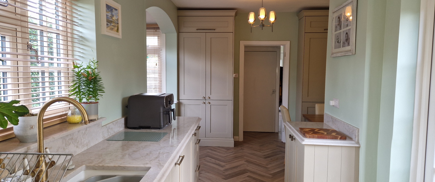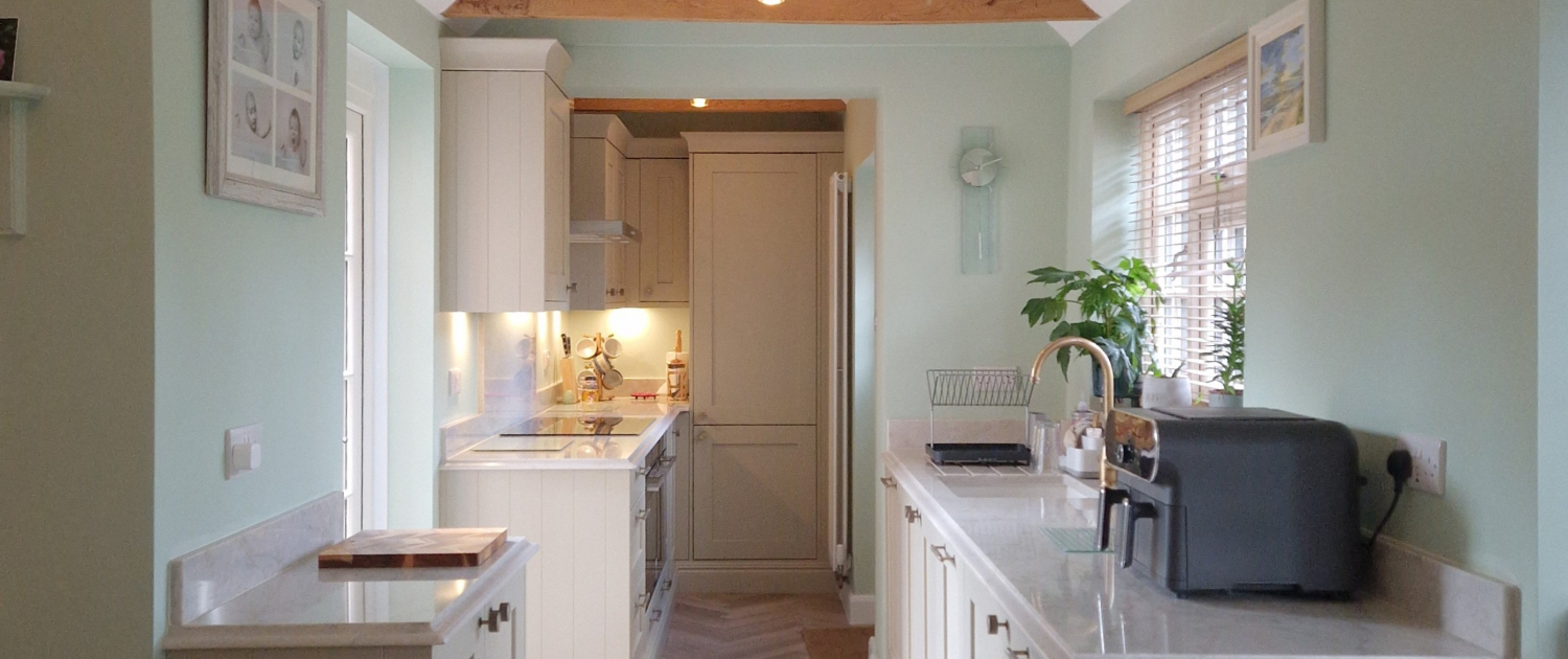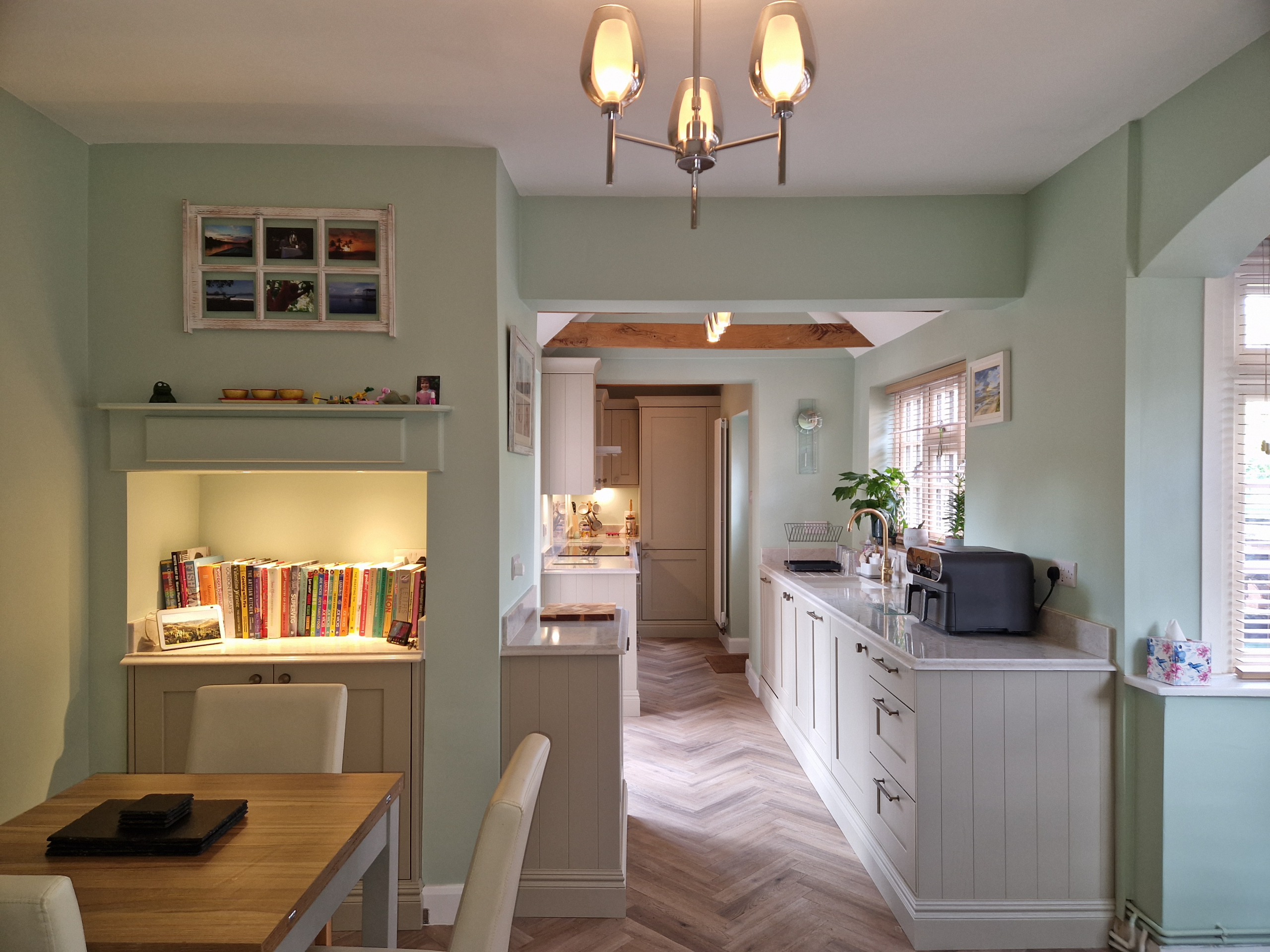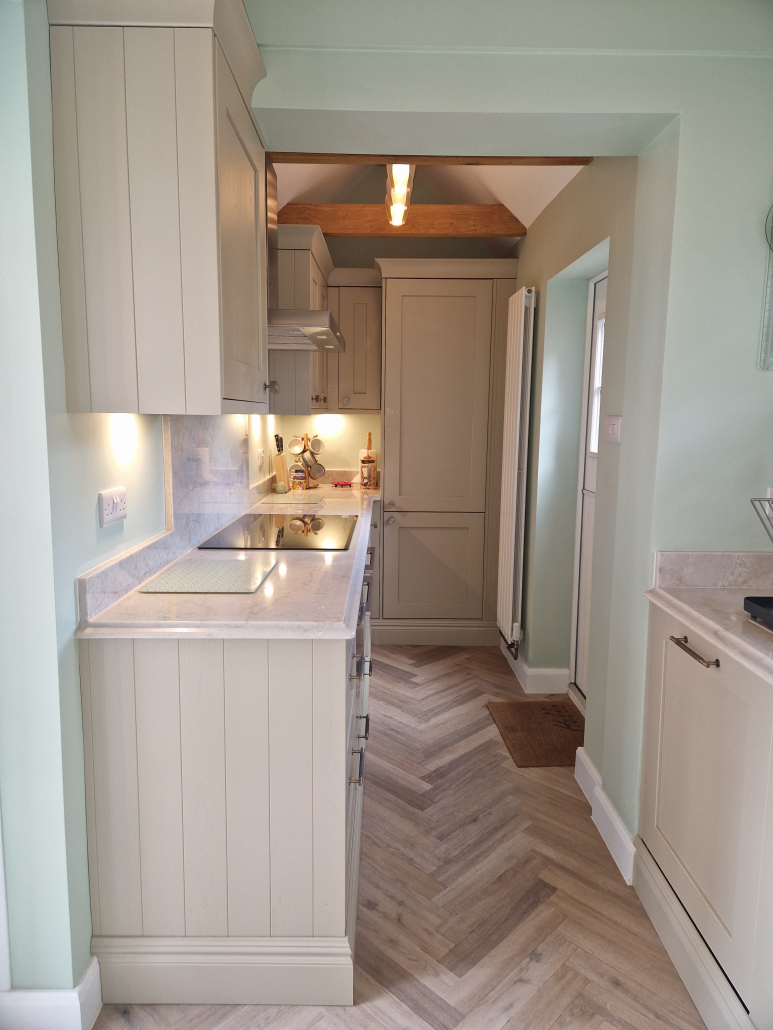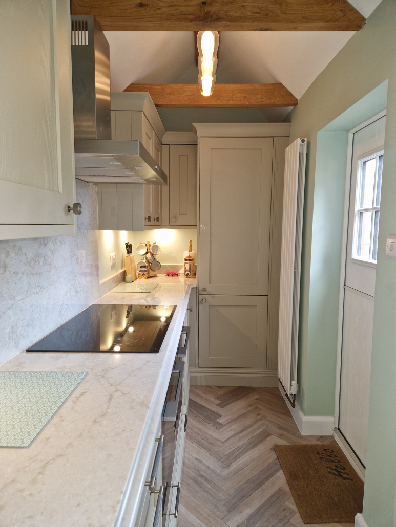 This charming galley kitchen features mid-beige cabinetry, complemented by a traditional skirting plinth that adds a classic touch. The earthy-toned quartz worktops are finished with a refined ogee edge, offering a sense of quiet luxury. Brass handles elevate the overall warmth of the space, tying in beautifully with the soft green walls and natural wood accents. Exposed ceiling beams and chevron wood flooring add rustic character and depth. A brass tap and thoughtful styling details, including greenery and soft lighting, enhance the kitchen’s cozy yet refined atmosphere. Large windows and French doors allow natural light to flood the space, creating a bright and welcoming environment.