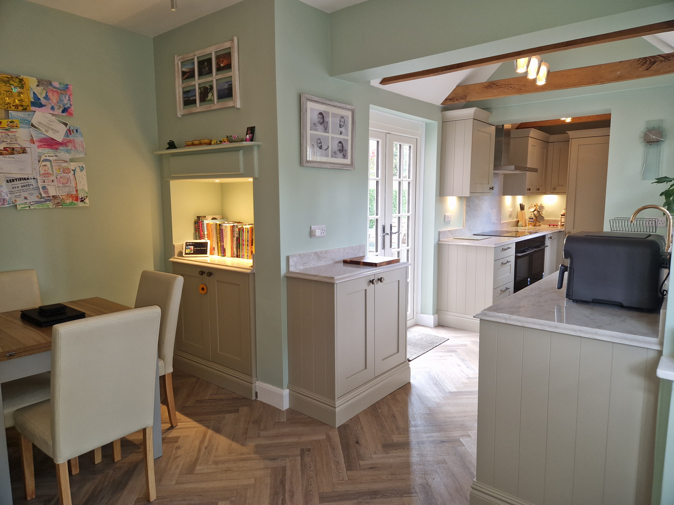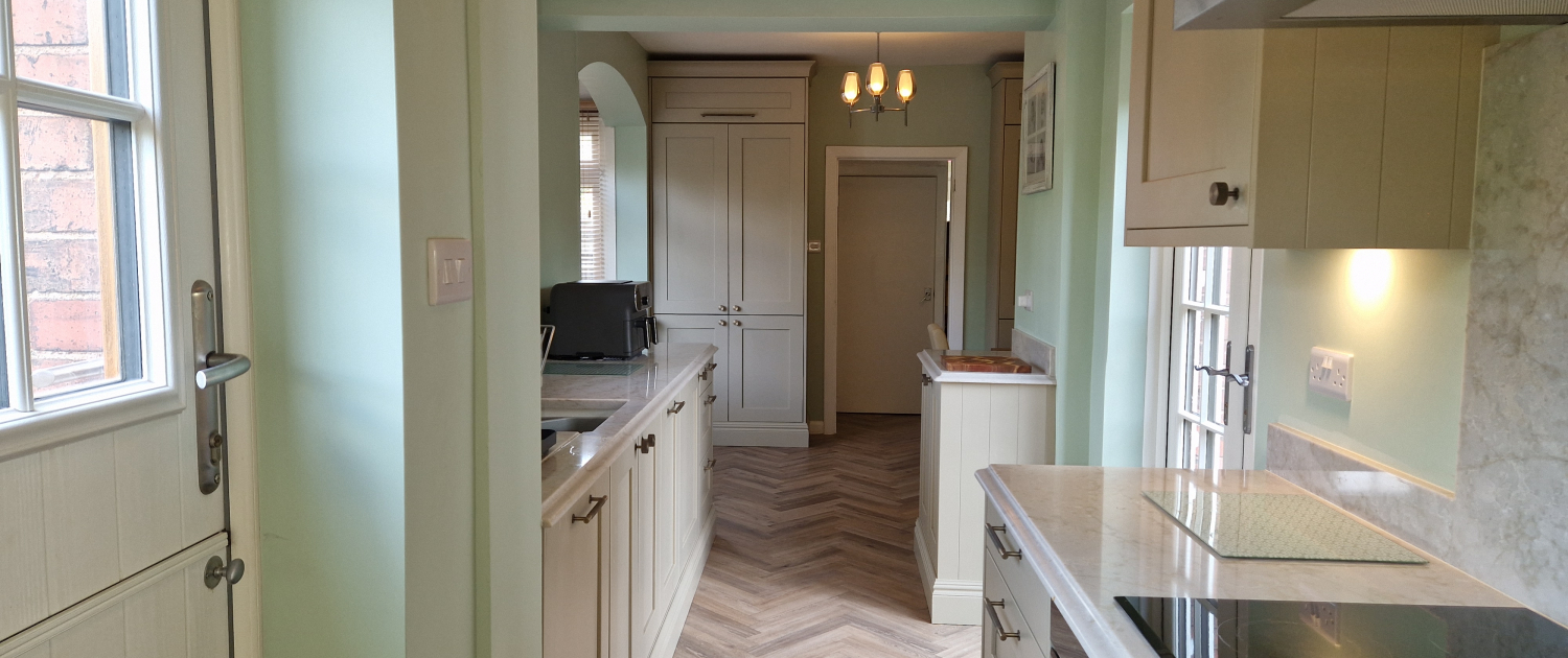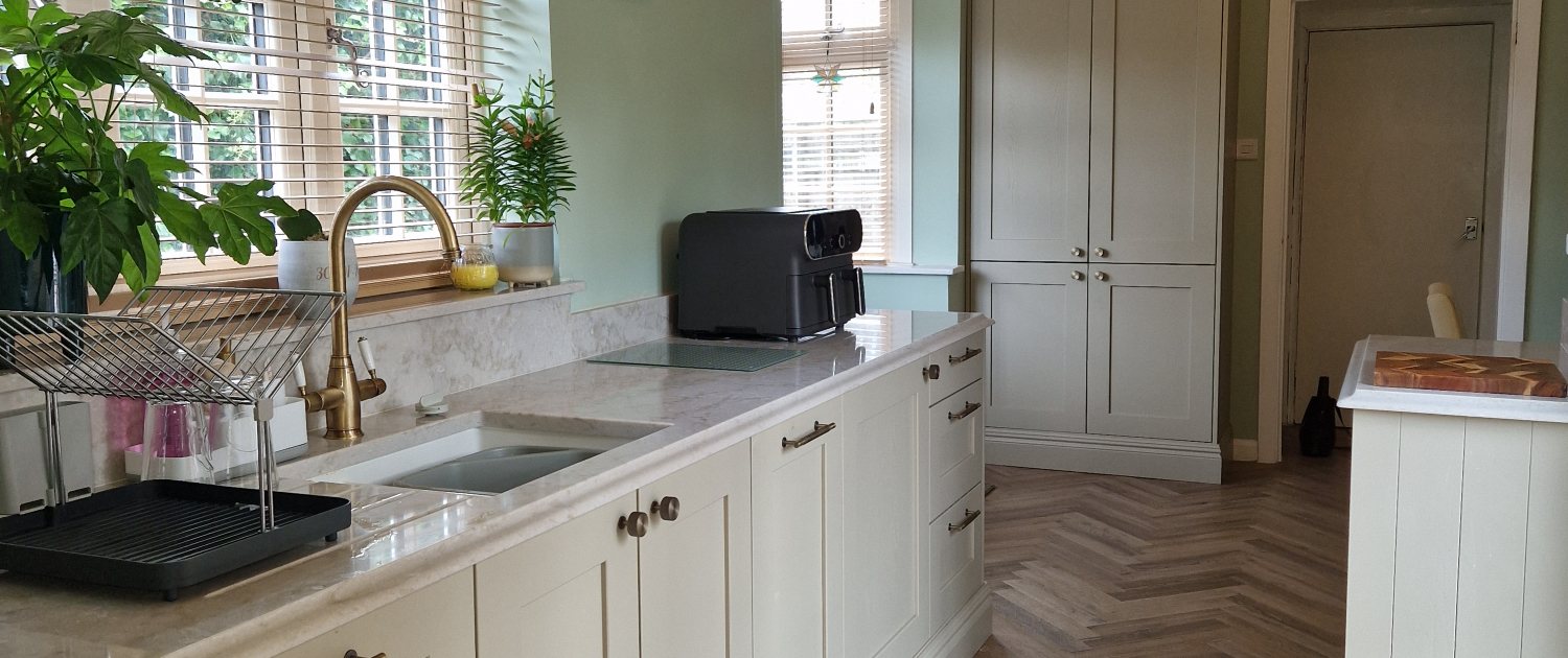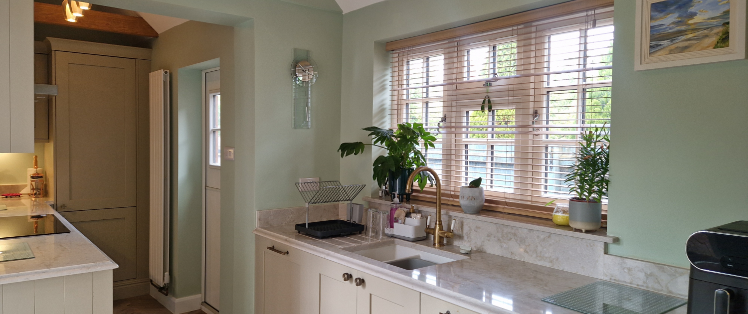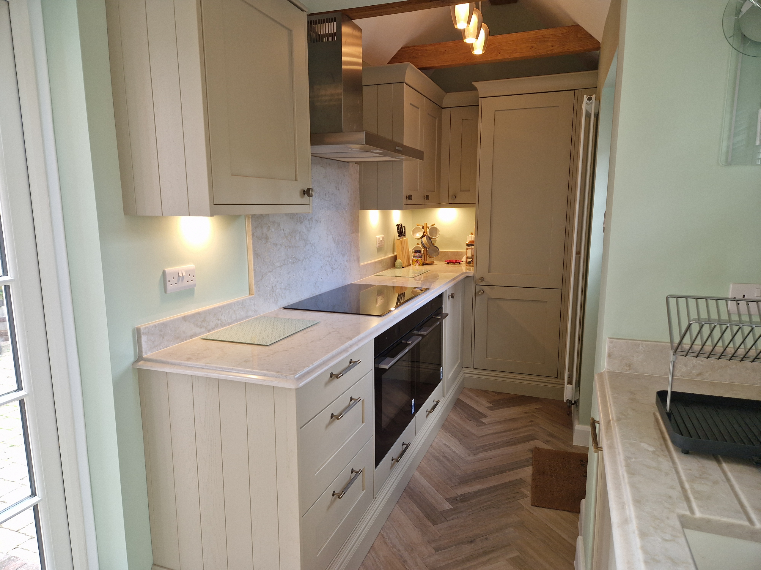 This charming galley kitchen features mid-beige cabinetry, complemented by a traditional skirting plinth that adds a classic touch. The earthy-toned quartz worktops are finished with a refined ogee edge, offering a sense of quiet luxury. Brass handles elevate the overall warmth of the space, tying in beautifully with the soft green walls and natural wood accents. Exposed ceiling beams and chevron wood flooring add rustic character and depth. A brass tap and thoughtful styling details, including greenery and soft lighting, enhance the kitchen’s cozy yet refined atmosphere. Large windows and French doors allow natural light to flood the space, creating a bright and welcoming environment.