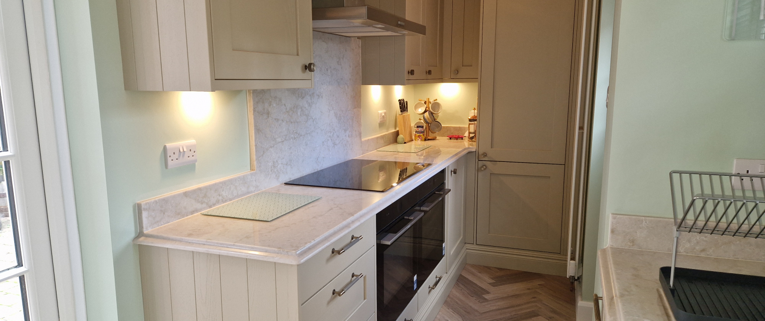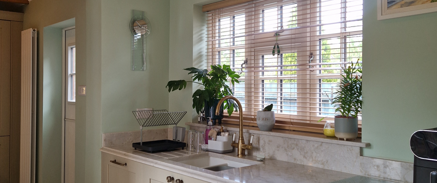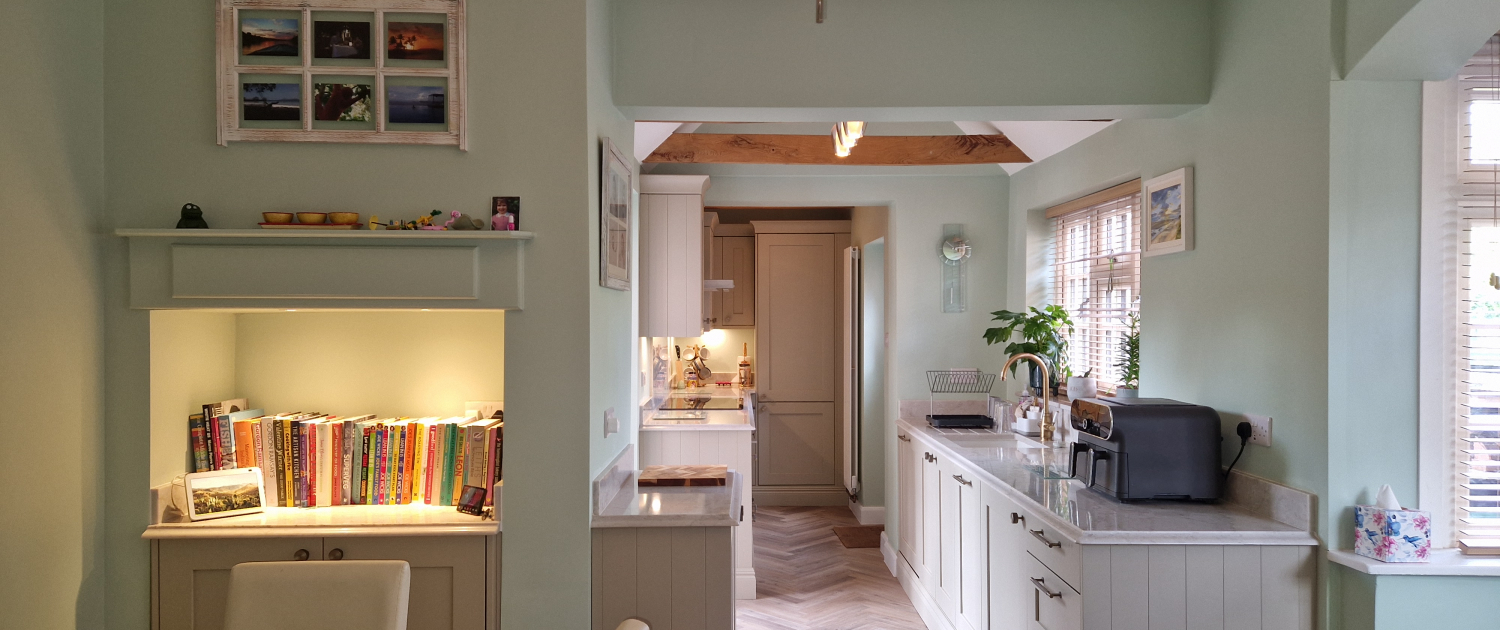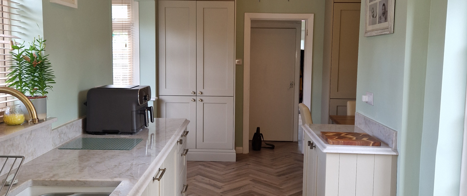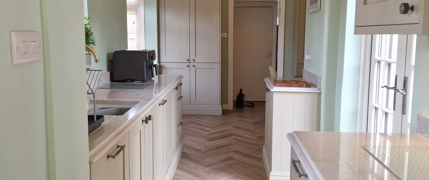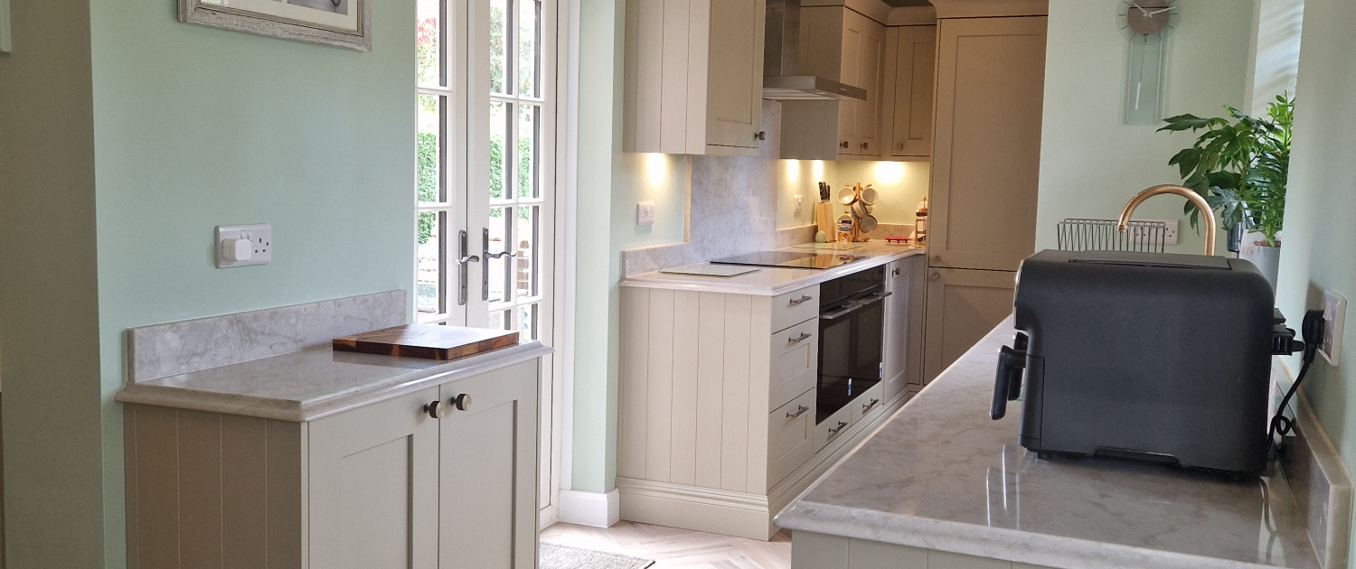 This charming galley kitchen features mid-beige cabinetry, complemented by a traditional skirting plinth that adds a classic touch. The earthy-toned quartz worktops are finished with a refined ogee edge, offering a sense of quiet luxury. Brass handles elevate the overall warmth of the space, tying in beautifully with the soft green walls and natural wood accents. Exposed ceiling beams and chevron wood flooring add rustic character and depth. A brass tap and thoughtful styling details, including greenery and soft lighting, enhance the kitchen’s cozy yet refined atmosphere. Large windows and French doors allow natural light to flood the space, creating a bright and welcoming environment.