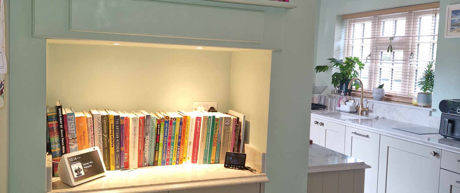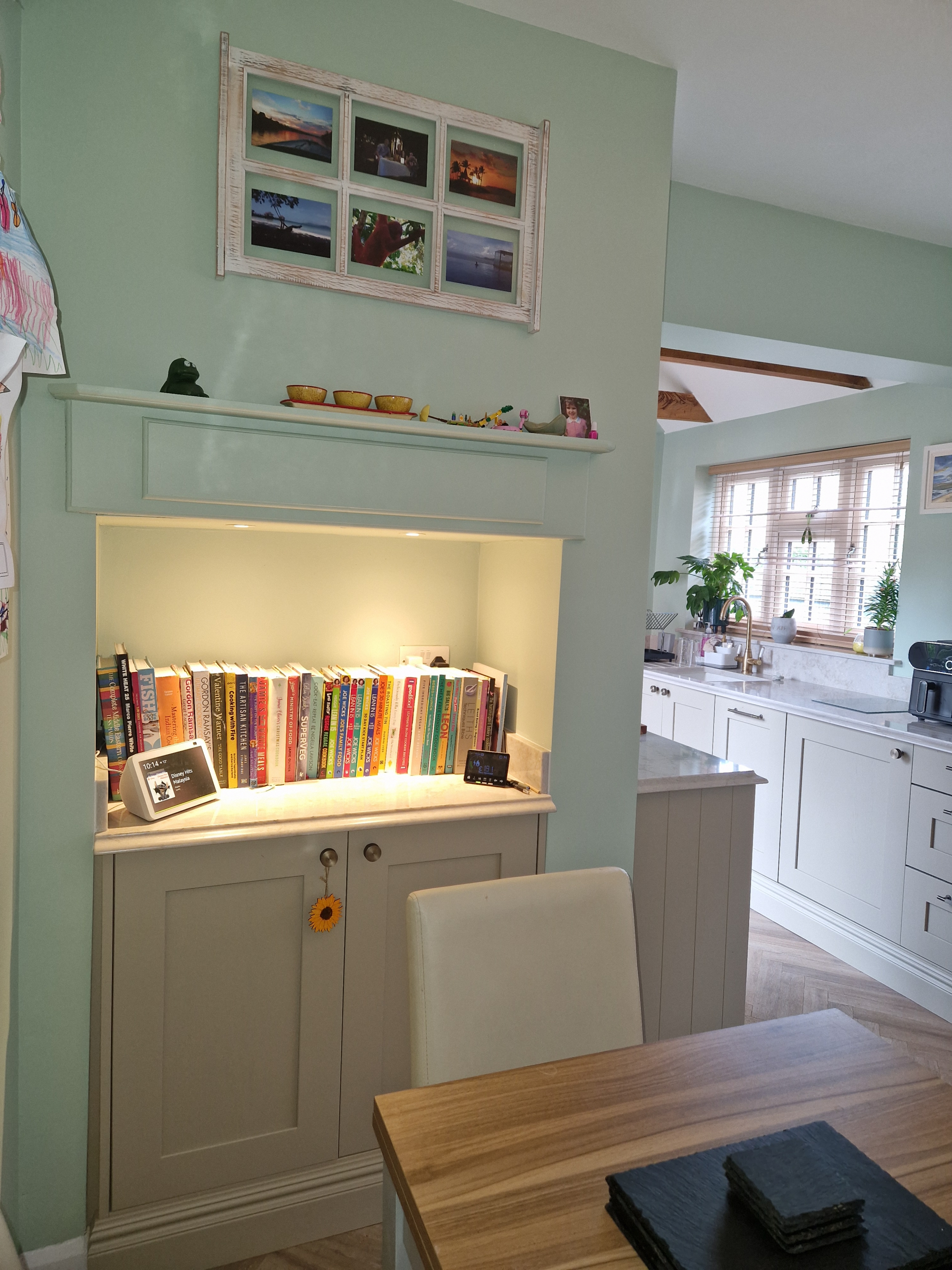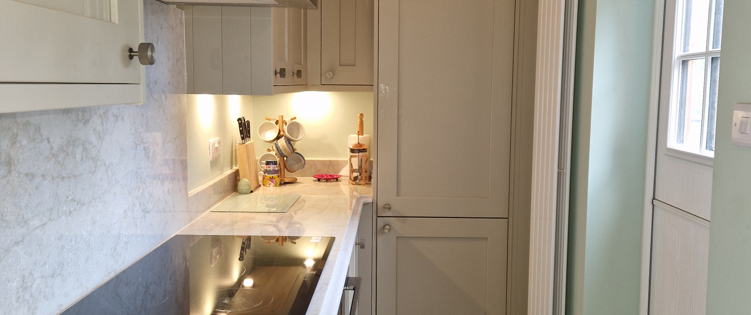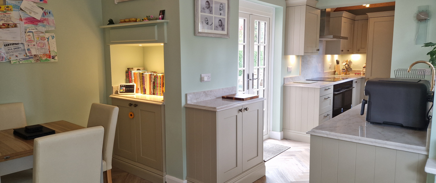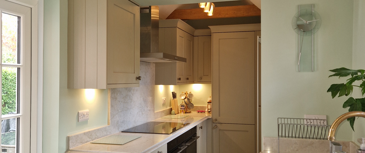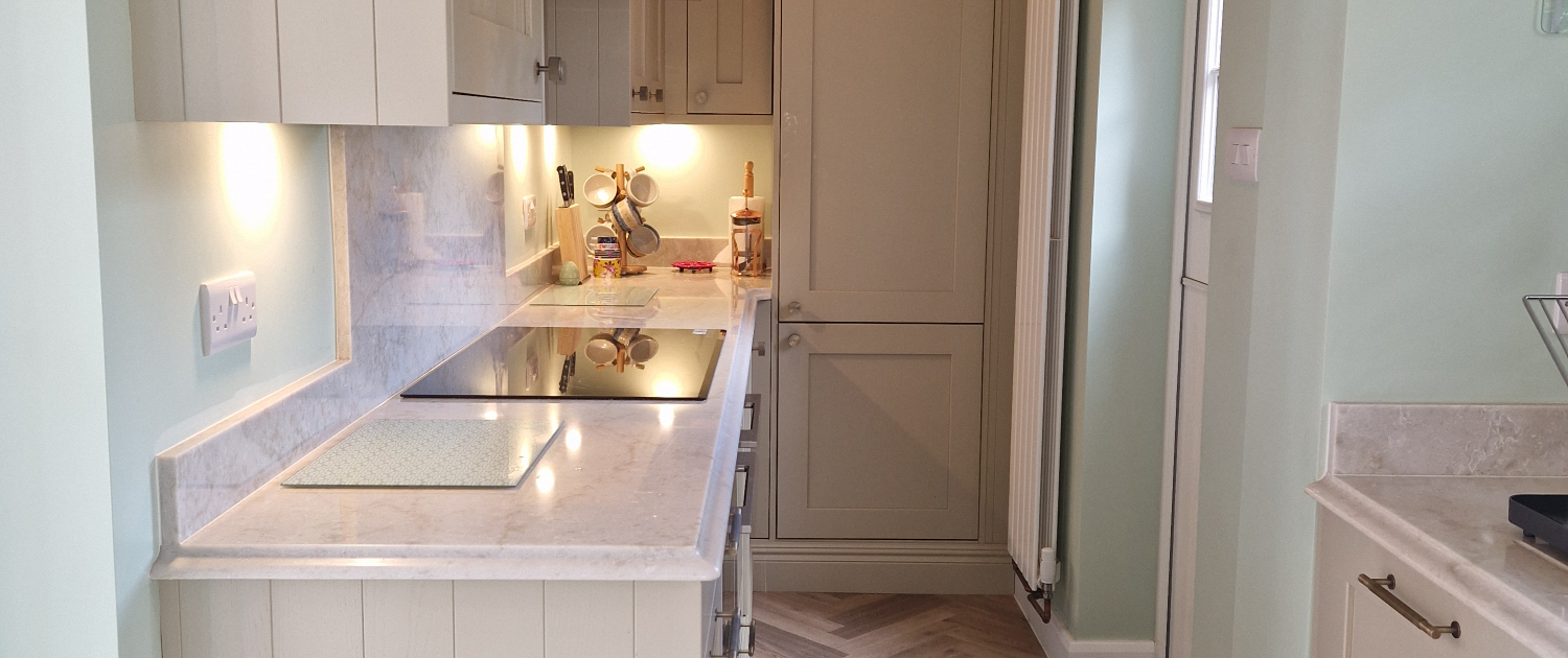 This charming galley kitchen features mid-beige cabinetry, complemented by a traditional skirting plinth that adds a classic touch. The earthy-toned quartz worktops are finished with a refined ogee edge, offering a sense of quiet luxury. Brass handles elevate the overall warmth of the space, tying in beautifully with the soft green walls and natural wood accents. Exposed ceiling beams and chevron wood flooring add rustic character and depth. A brass tap and thoughtful styling details, including greenery and soft lighting, enhance the kitchen’s cozy yet refined atmosphere. Large windows and French doors allow natural light to flood the space, creating a bright and welcoming environment.